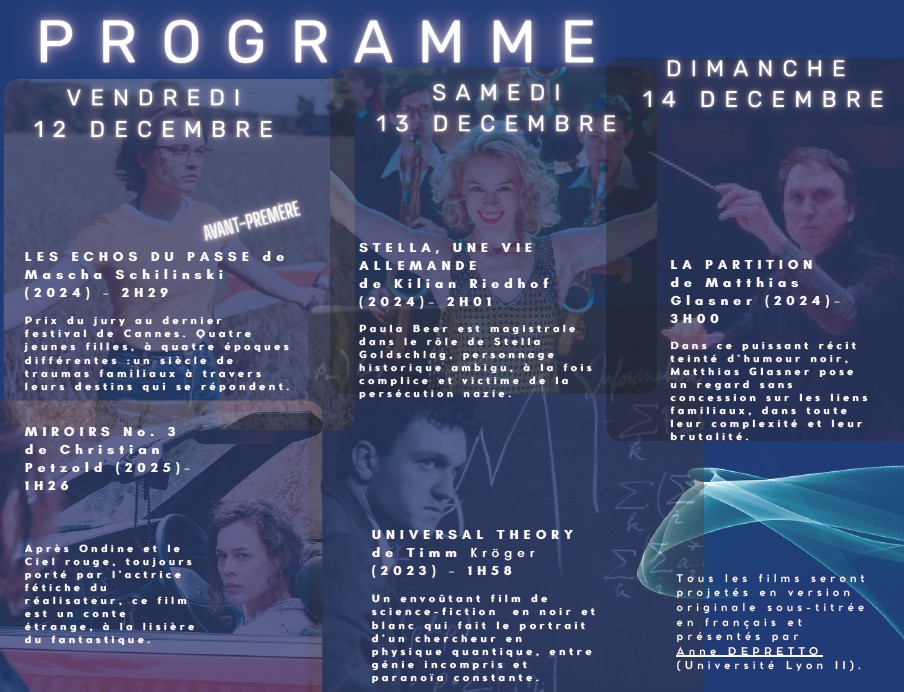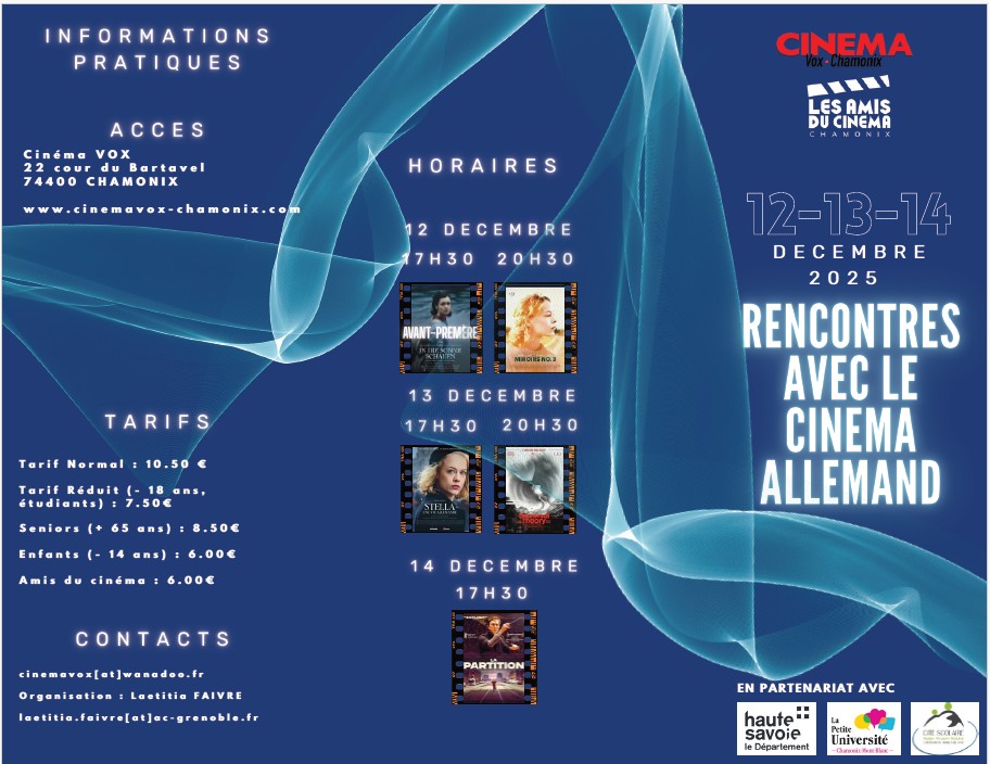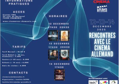Les élèves germanistes et ceux de premières et terminales option audio- visuel du Lycée Saint- Joseph de Sallanches se rendront le vendredi 12 décembre de 8.30 à 17.00 au Cinéma Vox de Chamonix pour assister à la projection de deux films allemands, en allemand sous- titrés français, dans le cadre d’un mini festival organisé par les enseignantes d’allemand du Lycée Frison Roche de Chamonix et du Lycée Saint- Joseph de Sallanches, en collaboration avec l’association Les amis du Cinéma de Chamonix.